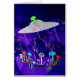 Groene buitenaardse hoofdpeuken uit het ruimteschip en een veld met sterke piepende paddenstoelen in veel kleuren met stromende harten groeit eronder.