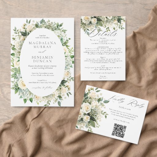 This elegant watercolor floral design features beautiful white hydrangeas, white roses, and fresh greenery with delicate baby's breath. Perfect for a classic white and green wedding or formal event.