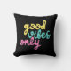 Dit kussensloop ontwerp is voorzien van een speelse "Good Vibes Only" boodschap in vet, kleurrijke tekst met een groovy vibe. De levendige pastelkleuren geel, blauwgroen en roze vallen prachtig op tegen een effen zwarte achtergrond, waardoor de woorden pop zijn. De belettering heeft een leuk, handgeschreven gevoel en voegt een vleugje positiviteit en warmte toe aan elke ruimte. Perfect voor het toevoegen van een gezellige en vrolijke sfeer aan uw interieur.