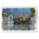 Alpiene dorpsscène met bergen op de achtergrond en eenden op het meer op de voorgrond.
