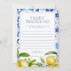 Geïnspireerd door de charme van de Amalfikust, biedt deze Kaart Family Traditions waterverf citroenen, mediterrane tegel en stijlvolle blauwtypografie. Een leuk en stijlvol spel om gasten betrokken te houden tijdens uw Italiaanse douche met citrusthema.