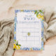 Geïnspireerd door de charme van de Amalfikust, is dit baby-geschenk bingobord voorzien van waterverf citroenen, mediterrane tegel en elegante blauwtypografie. Een leuk en stijlvol spel om gasten betrokken te houden tijdens uw Italiaanse douche met citrusthema.