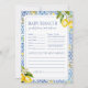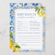 Geïnspireerd door de charme van de Amalfikust, biedt deze Kaart Predictions & Advice waterverf-citroenen, mediterrane tegel en elegante blauwtypografie. Een leuk en stijlvol spel om gasten betrokken te houden tijdens uw Italiaanse douche met citrusthema.