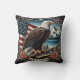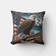 Een majestueuze zeearend staat op een boomtak, met uitzicht op een sereen bergmeer versierd met een Amerikaanse vlag en bloemenaccenten op de achtergrond.