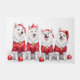 Charming and intelligent American Eskimo Dogs, with their snowy white coats, look bright and festive in their Christmas Santa outfits! A delightful design perfect for Eskie owners and spitz breed fans.