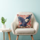 Dit werpkussen is voorzien van een illustratie van een Amerikaanse adelaar met vleugels uitgestrekt. De patterende is een abstractie van sterren en strepen.