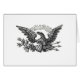 zwarte en witte illustratie van de Amerikaanse kale arend die pijlen, eikenbladeren en een schild aanklonken.