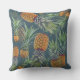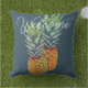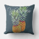 Ananas welkom kussen. Donkergrijs-blauw met twee ananassen en "welkomsttekst" aan de ene kant met een patroon van ananassen aan de andere kant. Kussens zijn er in twee maten en hebben stofselecties voor binnen- of buitengebruik.