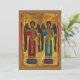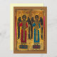 middeleeuws pictogramschilderij van twee engelen, michael en gabriel op engel in rode cloak, en de andere in een rode cloak,  gouden sahes kruiste over de borst en gouden  passeringen aan het einde van de stollen, donkerbruine vleugels, met een staf en een rond voorwerp in hun handen, met een achtergrond gevuld met metallic goudbladeren. helder en helder, middeleeuws Christelijk schilderij blauw, rood en goud met een patrooneffect.