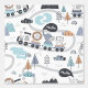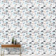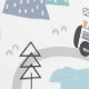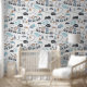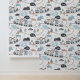 This delightful peel and stick wallpaper features a playful scene showcasing a lion, a tiger, and an elephant with a speech bubble reading “Hello,” all joyfully riding in a train on a curvy train track. The backdrop is adorned with charming elements of nature, including trees, mountains, and rainbows, creating a vibrant and imaginative atmosphere. The color palette includes shades of blue, gray, black, peach, and white, making it particularly well-suited for a boy's nursery, bedroom, or playroom.