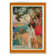 Klassiek vintage-poster dat is afgegeven door het Franse PLM-spoorwegbedrijf adverteren overdag of 's nachts naar Antibes te rijden. Het show een modieuze dame met haar hond die de stad in de gaten houdt.