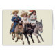Drie ruiters te paard - kinderen rijden op hun pony's De kinderillustratie shows drie kleine Victoriaans kinderen die een ritje maken op hun pony's. Deze ouderwetse kinderen zien eruit alsof ze gekleed zijn in de mooiste kleding van hun zondag, de twee kleine meisjes in mooie jurken en het kleine jongetje in een matrozenpak. Het antiek schilderij voor kinderen en pony is een Victoriaans voorbeeld, uit de late jaren 1800.