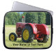 Een boerderij trekker, geparkeerd op een vlak grijs veld op een landbouwtentoonstelling. Grote, vleesachtige banden met mooie gerestaureerde rode verf en contrasterende gele bandvelgen.