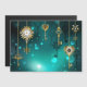 Goud, antiek sleutels met versnellingen en wijzerplaten hangen aan gouden kettingen op lichtgroene achtergrond.