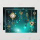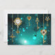 Goud, antiek sleutels met versnellingen en wijzerplaten hangen aan gouden kettingen op lichtgroene achtergrond.