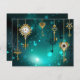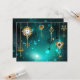 Gouden, antieke sleutels met tandwielen en wijzerplaten hangen aan gouden kettingen op een lichtgevende groene achtergrond.