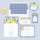 Met de hand geschilde waterverf citroenen met groene bladeren en bloesems tegen een blauw en wit ontwerp van keramische tegel.