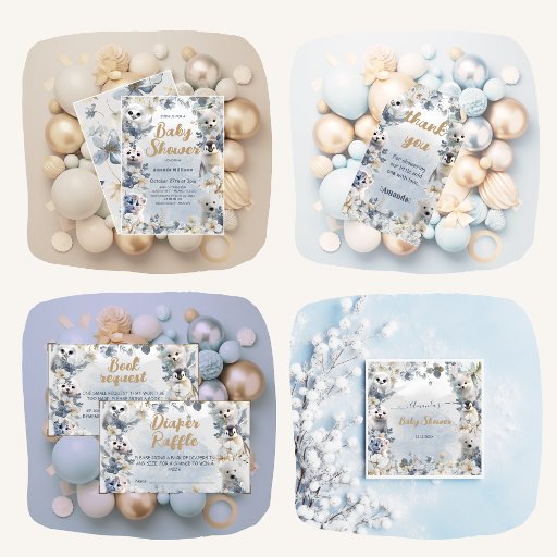 Introductie van het "Fuzzy, Soft, and Fluffy Arctic Animals Baby shower Collectie" - een grillig en hartverwarmend thema ontworpen om de komst van een kostbare bundel vreugde te vieren. Dit betoverende collectie combineert de zachte charme van zacht lichtgrijs en rustgevende blauwe pastelbloemelementen met de schattige aanwezigheid van Arctic animal favorieten. Je baby shower zal veranderen in een winterwonderland met de opname van besneeuwde tijgers, zeehonden, beren, vossen, uilen en pinguïns, allemaal afgebeeld in de zoetste en pluizigste vorm denkbaar. Deze kleine wezentjes brengen een vleugje Arctische magie naar je viering, waardoor een gezellige en uitnodigende sfeer ontstaat voor je gasten. Het zachte kleurenpalet en de delicate bloemmotieven in lichtgrijs en pastelblauw roepen een gevoel van rust op, ideaal voor een baby showers ambiance die rust en warmte uitstraalt. Dit collectie is een eerbetoon aan de gevoelige momenten die je met je dierbaren deelt, terwijl je vooruitloopt op de komst van je nieuwste familielid.
