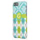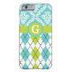 Argyle en damast patroon groen, aqua monogram iPhone 6 hoesjes. Dit schattige, meisjesachtige ontwerp heeft een argyle patroon in limoengroen, turquoise, wit met zwarte kruisende lijnen en aqua witte damast op het bovenste deel. Er zit een groene band dwars en een cirkel met je monogram. Dit elegante, stijlvolle en stijlvolle ontwerp is volledig aanpasbaar. U kunt de achtergrondkleur wijzigen - turquoise en tekstkleur kiezen uit meer dan 200 kleuren uit Zazzle-kleurenkaart. Hedendaags en modern met een retro flair.