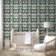 Dit kunstwerk heeft een ingewikkeld patroon geïnspireerd op Art Deco-ontwerp, gekenmerkt door vloeiende, symmetrische lijnen en geometrische vormen. Het ontwerp is weergegeven in een verfijnd palet van diep blauwgroen, crème en subtiele gouden accenten, waardoor een verfijnde en elegante look wordt gecreëerd. De zich herhalende motieven vormen een complex, verweven patroon dat zowel harmonie als beweging uitstraalt. De combinatie van bochten en scherpe hoeken voegt een dynamische kwaliteit toe aan het ontwerp, terwijl het kleurenschema een gevoel van tijdloosheid en klassieke stijl behoudt.