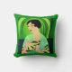 Kussen in een modern, semi-abstract, Art Deco portret van een dame in een kimono, met een ventilator, tegen een jade groene abstracte achtergrond
