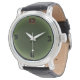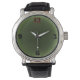 Oversized mannen horloge met een origineel, uniek Art Deco-gezicht, wat een gloeiend groen jade licht suggereert. De "12" is in koraalrood, terwijl de andere cijfers in een glanzend zwart verschijnen.