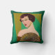 Kussen in een modern, semi-abstract, Art Deco geïnspireerd portret van een demure dame, met een ventilator, tegen een jade groen en goudkleurige achtergrond