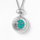 Klassieke Art Deco moon en sterren ontwerpen in geborsteld metallic zilver, met een enamel look, turquoise / pauock background