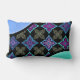 Dit extra knusse rechthoekige kussen is versierd met een originele Art Deco geïnspireerde behandeling van een serie Star Flower printer's ornamenten in verschillende tinten blauw, aqua, paarse, violet, & bleek geel plus top-left & bottom-right bochtige hoeken in blauw & seafoam die prachtig opvallen tegen de zwarte achtergrond. Zie HoMeArts' mix & match coördinerende producten.