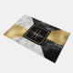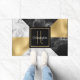 Modern neemt een kunstmatig deco-geïnspireerde deurmat op, gemaakt in een geometrisch patroon van gouden toon-folie, witte marmer en zwarte marmer. Een zwart en gouden vierkant, in het midden, heeft een gouden gele monogram met één letter en witte tekst klaar om zich te personaliseren. Een liefdevol decor en een geweldig cadeauidee.