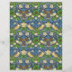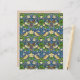 Papier in een William Morris Art Nouveau wandtapijt patroon van gestileerde vogels, bloemen, aardbeien, en bladeren in zachte tinten van blauw, groen, beige en bruin op een donkere indigo blauwe achtergrond