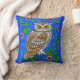Pillow in een Art Nouveau geïnspireerde illustratie van een bruine en roomkleurige uil op een kobaltblauwe en koraalvormige oranje florale achtergrond