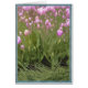Kleurfoto van roze tulpen en gras. 5 x 7 inch (portret). Digitaal veranderd. Blauwe grens.