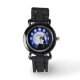 Astronomers Moon Phase Watch toont een jonge astronoom die de maan bekijkt. 12 maanfasen worden getoond in plaats van de gebruikelijke kloknummers.