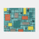 Een modern, modern, geometrisch abstract kunstontwerp uit de midden van de eeuw met lijnen, vierkantjes en rechthoeken in turquoise, blauwgroen, oranje en geel.
