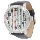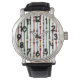 Dit mannen horloge heeft een middeleeuws modern ontwerp van atoomlijnen met "veren" aan beide uiteinden en een omtrek rond elk.