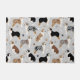 Cute Australian Shepherds / Aussie dogs in zwarte, bruine en blauwe jassen zitten en staan verspreid botten en poetafdrukken op een lichtgrijze achtergrond.