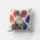 Een vrolijke Australian Shepherd-hond zit voor kleurrijke design met pootafdrukken en toont een levendige mix van rode, paarse en blauwe tinten
