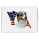 USA! Amerika! Roep je trots met deze geweldige vlag Patriottische achtergrond met deze AKC hondenras Australian Shepherd in de voorgrond. Show je trots met dit ontwerp op een T-shirt, mok en nog veel meer!