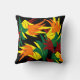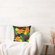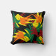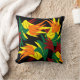 Dit opvallende sierkussen heeft een abstract bladerpatroon in alle herfstkleuren: sinaasappel, geel, rood en groen. Het ontwerp wordt herhaald op de achterkant.