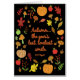 Herfst/Winterontwerp met bladeren, pompoenen, appelen, bessen, pinecones en paddenstoelen. W.C. Bryant.