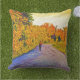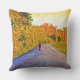 Een vrouw loopt langs een weg met bomen die met herfst bladeren.