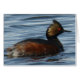 Ging Grebe Kaart. Het gloeiende rode oog van de geoorloofde kwab kan van een vrij grote afstand worden gezien. Ze voeden zich door naar de bodem van meren en vijvers te duiken om op kleine vissen, waterinsecten, slakken en dergelijke te jagen.