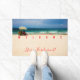 In de originele foto van ZoeSPEAK op deze deurmat - Het is een heldere, zonnige dag op Jupiter Beach. De lucht is diepblauw, de wind waait en de blauwgroene oceaangolven met hun schuimige witte topjes rollen zachtjes naar binnen. Twee mensen zitten in de minimale schaduw van een gele strandparaplu in het gouden zand en maken de strandscène van Florida af. Er is een tekst met de tekst "WELKOM" en "Het leven is een strand in Florida!". Dit is ingesteld voor u om te personaliseren of te verwijderen als u dat wilt.