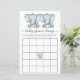 Cute tweeling baby jongens bingo shower spel met "baby shower bingo" in een stijlvol zachte grijze script met zwieren en een pastelblauwe waterverf van tweeling baby olifanten jongens.