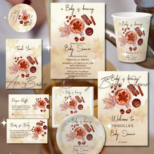 Een Baby is brouwen herfst herfst baby shower sjabloon uitnodiging instant download, waterverf warme chocolademelk kaneel specerijen koekjes esdoorn bladeren, witte achtergrond voor de herfst herfst thema baby shower.