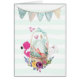 Een wenskaart van een baby/baby shower met een bundelbanner die boven een schattige waterverf hangt, is een ei dat in een mandje zit. Ook gedecorbeerd met linten, bogen, bloemen en weinig hart. Een roze flamingo en een wit konijnenkonijn zitten aan beide zijden geduldig te wachten op de grote dag. De binnenkant van de kaart heeft een bundelbanner en een gepersonaliseerd bericht.