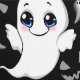 Het afbeelding heeft een collectie van cartoon geesten tegen een zwarte achtergrond. De geesten zijn wit met grote, expressieve ogen in verschillende kleuren, waaronder blauw, groen en bruin. Sommige geesten hebben pompoenachtige grijns in hun lichaam gekerfd, terwijl anderen verschillende gezichtsuitdrukkingen vertonen, zoals glimlachen, knipogen of pruilen. Oorspronkelijke vectorkunst Copyright BluedarkArt TheChameleonArt.