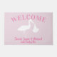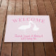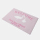 Welkom uw gasten bij uw nieuwe familie met dit roze en witte stork doormat. Voeg gewoon de naam van de trotse ouders en de naam van de baby toe