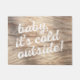 Eenvoudige en moderne doormat of vloermat voor het winterseizoen dat zegt: "baby, het is koud buiten" in een gestampte stijl script op een plankhoutachtergrond.